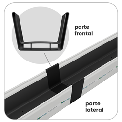 Tampões de entrada para vedar a extremidade da calha e tampão de saída com tubulação para recolhimento do drenado.
